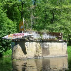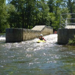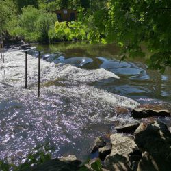 Aber wir haben ja zum Glück sehr erfahrenen Kanadier- Paddler dabei, die uns über so manche Schwierigkeit hinweg lotsten. Gleich die Bootsrutsche am ersten Wehr wird so zu einer Herausforderung, die unterschiedlich souverän gemeistert wurde – immerhin: alle sind im Boot geblieben. Abgesehen von den Wehren gab es noch diverse Steine, die da einfach so herumlagen und entdeckt werden wollten. Diese zu umfahren, gelang dementsprechend auch unterschiedlich. Die Steine zu umarmen (also sich zu ihnen hinzuneigen, statt gemeinsam wegzukippen) war eine sehr eindrückliche und nasse Erfahrung.