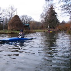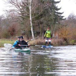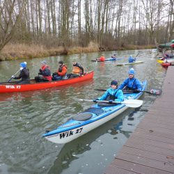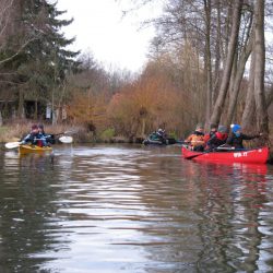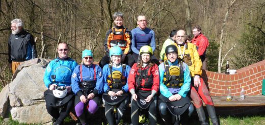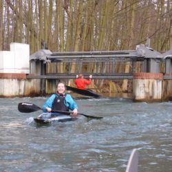 Klar, so eine große Gruppe mit einigen Ungeübten ist träge, und es dauert alles etwas länger: Bis endlich alle im Wasser sind, bis alle in der Schleuse sind, bis bei der Pause alle angekommen sind usw. Wir waren so viele, dass immer 2 Schleusengänge notwendig waren. Respekt gegenüber dem Nachwuchs, der diese Tour als zusätzliches Streckentraining im Slalomboot nutzte.
