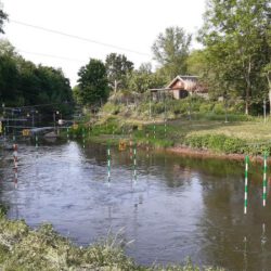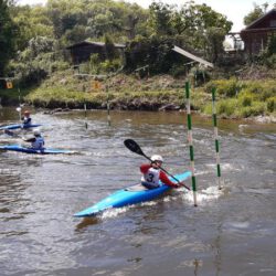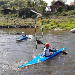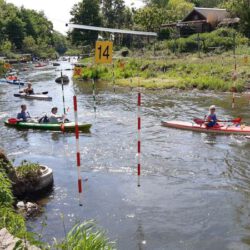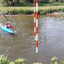 Schnell umgezogen ging es dann zur Erwärmung und ab auf´s Wasser. Dies war mein erster Wettkampf in meinem neuen Boot. Doch leider mussten wir vor dem Start sehr lange warten, da immer wieder Wanderboote kamen und manche leider nicht auf das Signal der Kampfrichter gehört haben, sondern einfach durchgefahren sind 😕 . Aus diesem Grund bekamen einige Sportler einen Wiederholungslauf, da sie durch Wanderfahrer behindert wurden. Ich zum Glück nicht. Dann ging es für mich aber doch endlich los. Der erste Lauf lief nicht ganz so wie ich es mir vorgestellt hatte, aber zum Glück gibt es ja noch einen zweiten Lauf. Also Boote wieder hoch und die zwei Stunden zwischen den Läufen vergingen wie im Flug, also alles wie immer. Der zweite Lauf lief zum Glück besser. Doch wie sich mal wieder zeigte, haben wir gegen die Leipziger keine Chance (Kinder aus der Sportschule). Doch Spaß macht es ja immer. Nach 5 Minuten Pause ging es dann zu den Mannschaftsläufen. Es war ein großes Chaos auf dem Wasser, da ja jetzt von jeder Mannschaft drei Leute auf dem Wasser auf den Start warteten. Und da wir die „falsche“ Startnummer hatten, hieß es nun warten, warten und noch mal warten. Also nochmal Füße im Wasser baumeln lassen und ein bisschen mit den anderen quatschen. Nach und nach bemerkten alle, das hinter den Bäumen große Rauchwolken aufstiegen und es nicht gut roch. Etwas später hörte man die Feuerwehr, wir wissen jedoch nicht was es war. Aber nun zu unserem Lauf: Es lief gut, wenig Berührungen und kein Tor ausgelassen. Im zweiten Mannschaftslauf haben wir uns dann etwas mehr Zeit gelassen mit dem Einsteigen. Noch ein bisschen den anderen helfen oder Spaß machen. Anschließend das ganze von vorne. Die beiden anderen waren dann noch baden, während ich mit einem Mädchen aus Erfurt gequatscht habe.