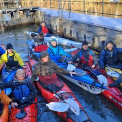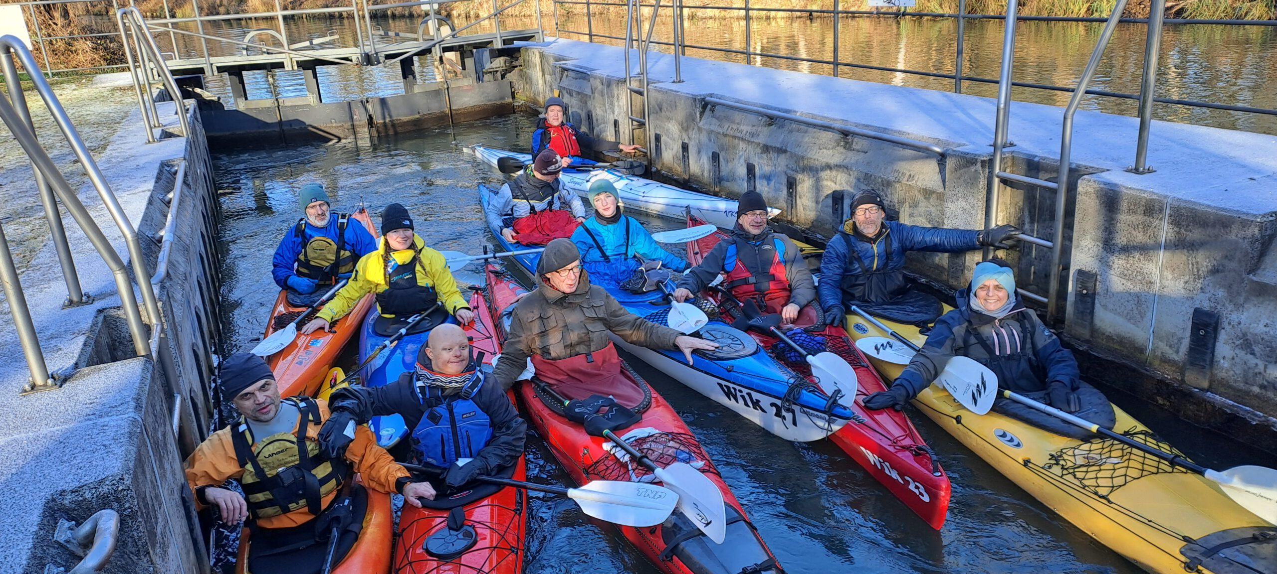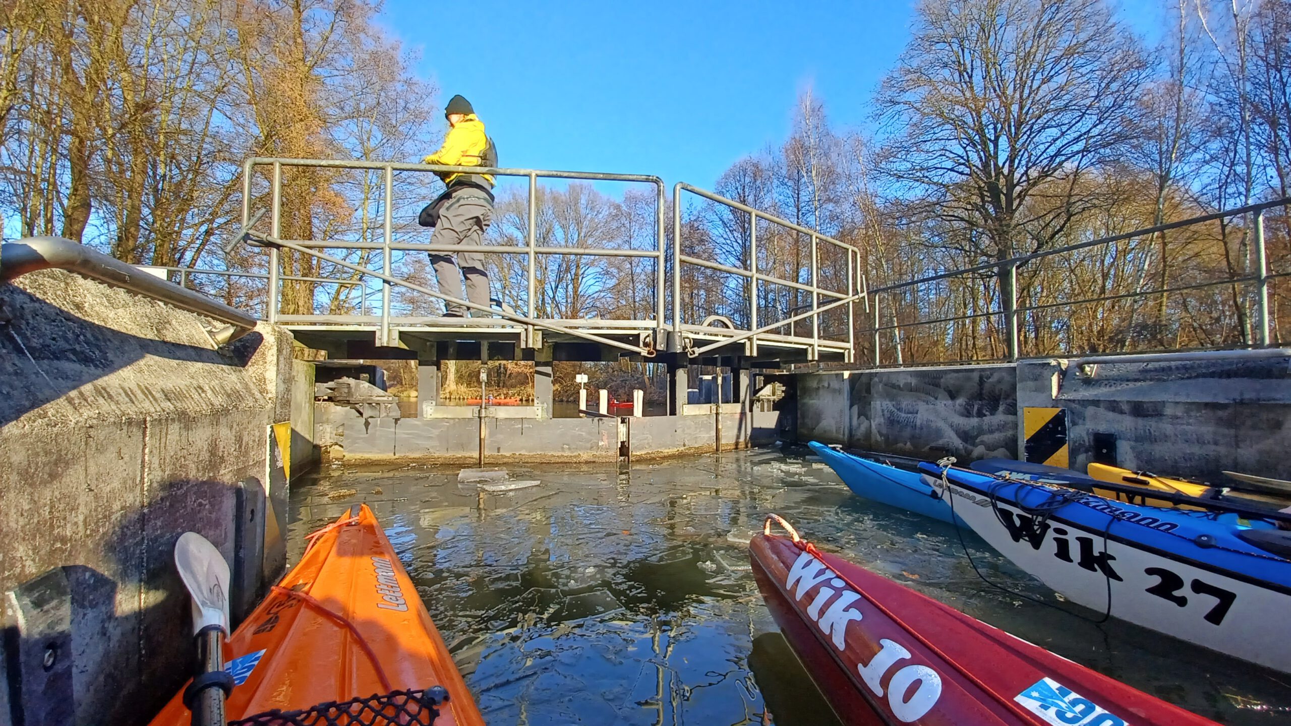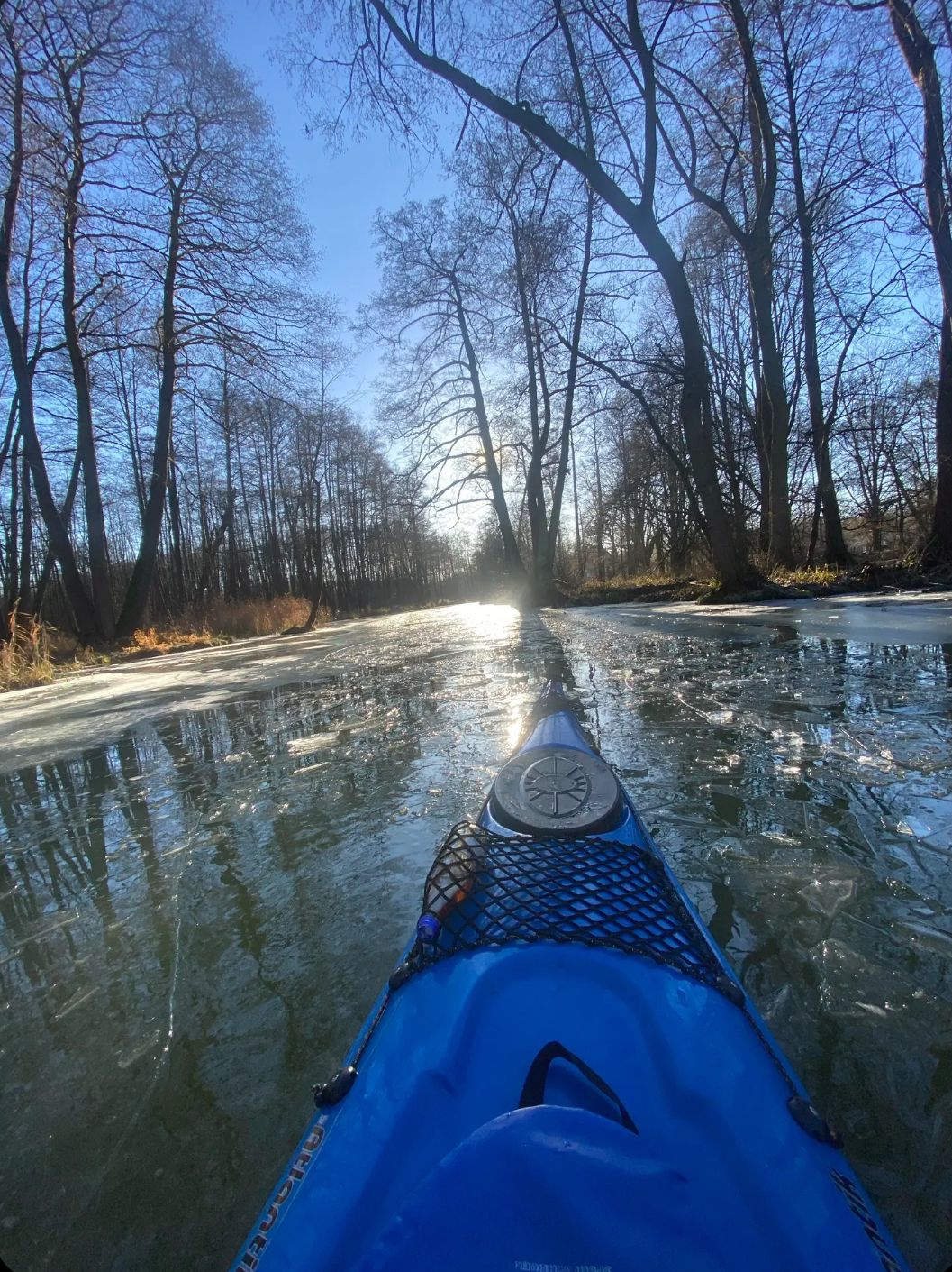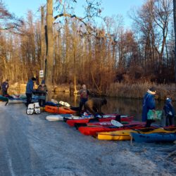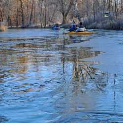 Nach der freundlichen Begrüßung durch den Platzwart hieß es 10.30 Uhr: abladen, warm anziehen und los. Wir starteten nach Westen – und schon auf der Hauptspree wartete die erste kleine Herausforderung. Teilweise leicht zugefrorene Wasserflächen mussten aufgebrochen werden, was mit Hilfe der PE- Einer- und Zweierkanus gut gelang.