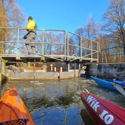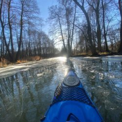 Die zweite Herausforderung ließ nicht lange auf sich warten: die Schleuse Spreez war stärker zugefroren als erwartet. Danach jedoch wurde es ruhig und winterlich-idyllisch. Bei Sonnenschein paddelten wir entspannt durch die still gewordene Landschaft Richtung Kalkofenschleuse, wo ein kurzes Umtragen sowie eine kleine Trinkpause eingelegt wurden.